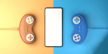 Concept of video game competition with gamepad and smartphone. Gaming. Gamer. Copy space. Banner. 3D Illustration.