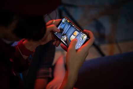 MOSCOW, RUSSIA - December 2019: back view of a close up of a woman hands playing online game on a smart phone lying on a couch at home