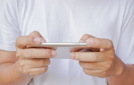 Close up of men hands holding touching mobile phone with blank copy space for your text message in cafe with light Sunset,Vintage tone.Selective focus