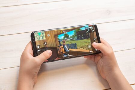 Sarajevo, Bosnia and Herzegovina - November 30, 2019: Garena Free Fire video game on Samsung Galaxy S9 plus smarthone in kid hands close-up
