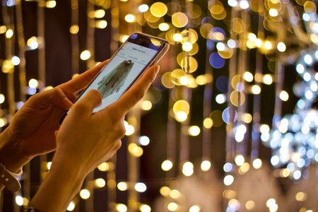 A person holds a smartphone, capturing bright bokeh lights in a city at night. The colorful lights create a festive atmosphere, filling the surroundings with joy.