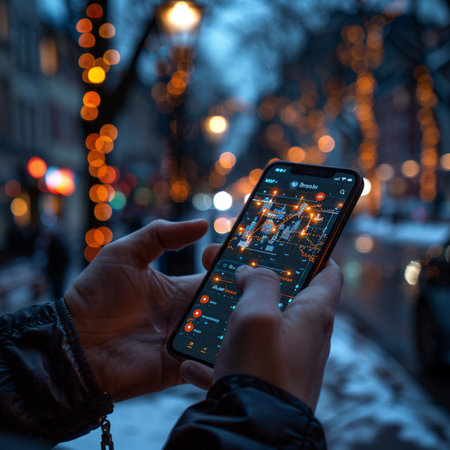 Tourist navigates a city at night using a smartphone app