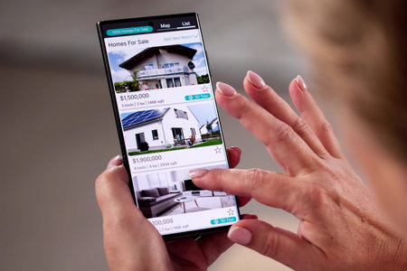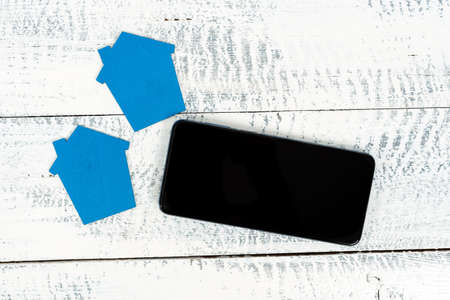 Searching, renting and purchasing real estate - apartment or house via smartphone mobile app. Close-up capture, selective focus.
