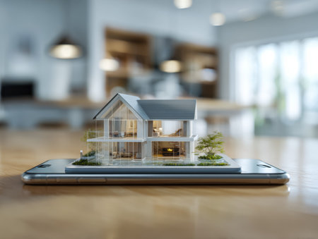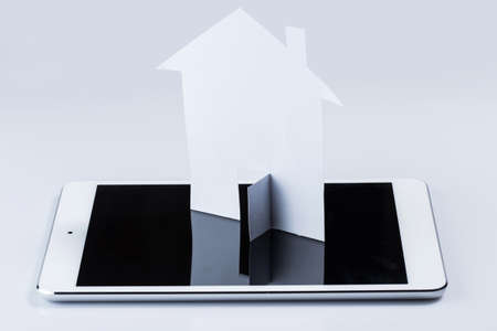 A miniature house sits on a tablet, highlighting advancements in real estate and technology integration.