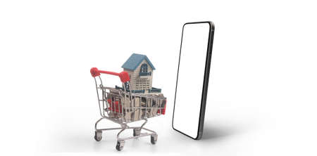 House mock-up on smartphone screen. Building design. Construction projects. Ads for the sale, purchase, rental of houses in gadget. Real estate concept. Buying home through apps. Collage on white. 3d
