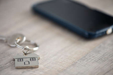 The key to the house on the keychain in the shape of the house, lies on the mobile phone. Smartphone, keys, car keychain on a wooden