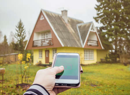 Person hand press lock/unlock button from distance on smartphone app to open/close rural home house door. Modern lifestyle technology concept.