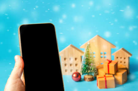 Mobile phone with blank screen and place for text, Christmas tree, houses and gifts. Online shopping concept. Holiday sales and promotions. Merry christmas and happy new year