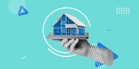 Construction control, management, sale of real estate through mobile applications concept. Cottage house and pictograms above the smartphone screen in the woman's hand. minimalist art collage