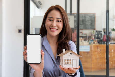 Real estate agent showing house model and mobile phone with blank white screen for advertisement
