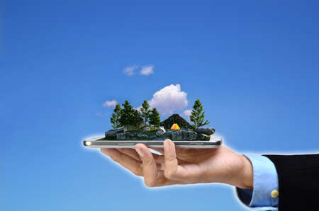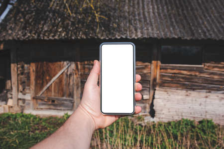 Smartphone mockup in a man's hand. Against the backdrop of an old house, a hut in the countryside