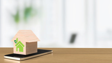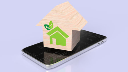 Wooden house toy and Smartphone on ground green grass with copy space.Real estate concept, New house concept, Finance loan business concept, Communications concept