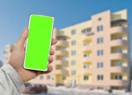 Man holding mobile phone with smart home app with unfocused apartment building on the background, green chromakey display for mockup