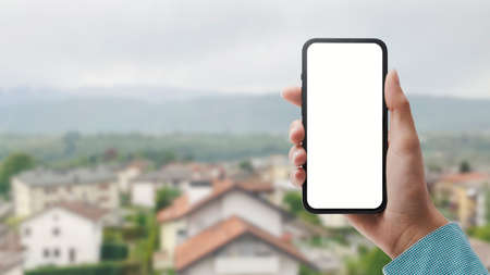 Woman connecting with her smartphone and searching for homes in her area, city in the background, blank screen on mobile phone, POV shot