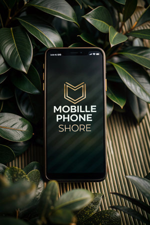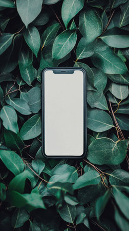 A sleek mobile device rests on a bed of lush green leaves, blending technology with nature in a serene setting.
