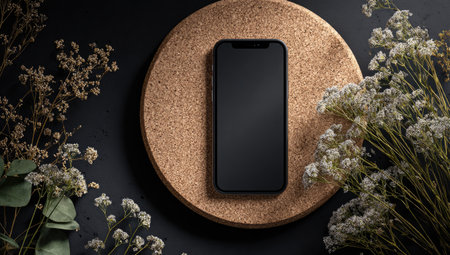 Dark-colored smartphone is positioned centrally on a round cork coaster. Dried flowers and greenery are artfully arranged around the coaster, creating a minimalist and aesthetic display. The dark background enhances the focal point of the smartphone and the flowers.