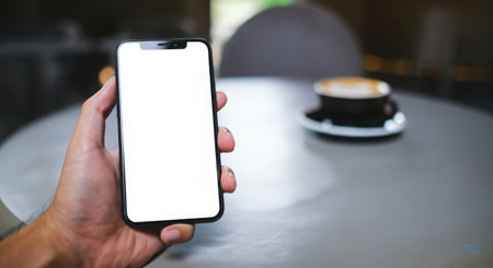 A hand holds a modern smartphone with a blank white screen. A coffee cup is visible in the blurred background on a table.