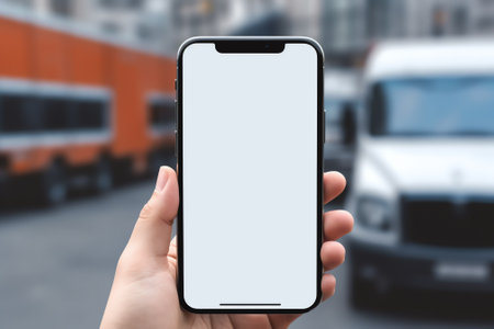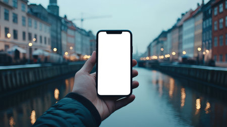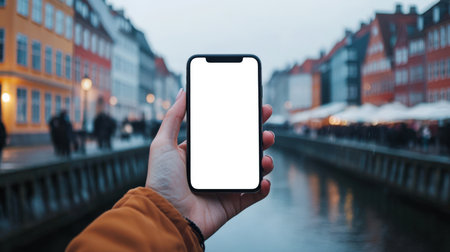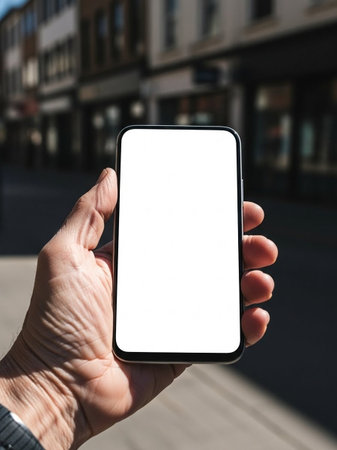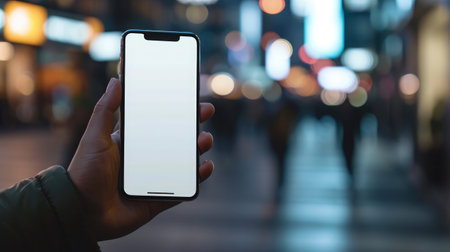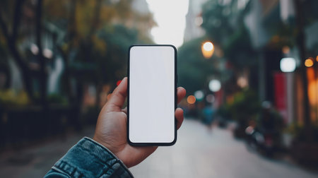 Mockup image of a hand holding a smartphone with a white screen in the street