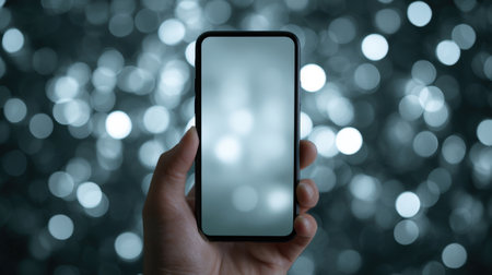 Hand holds smartphone against blurred background of shimmering lights, creating modern and stylish atmosphere. device screen is blank, inviting creativity and personalization