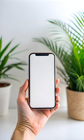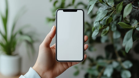 A hand holds a modern smartphone with a blank white screen. The phone is positioned against a blurred background with green plants. creating a clean and modern aesthetic. Perfect for showcasing mobile apps. websites. or designs.