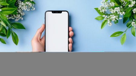 A person holds a sleek black smartphone featuring a blank display and a frameless design against a light backdrop, enhanced by green foliage for a fresh aesthetic. Generated AI