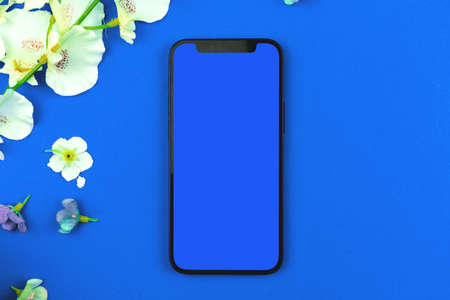 Smartphone with copy space on the table. Cellphone display mock up. Top view