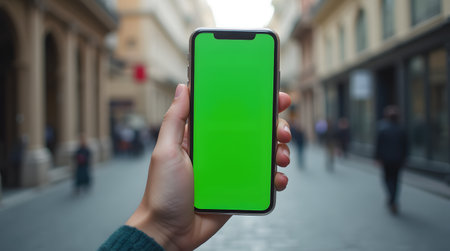 Close-up of hands holding a smartphone with a vibrant green screen, blurred urban background. Generative AI