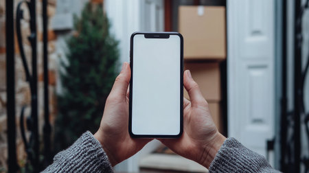 Hands Holding Smartphone With Blank Screen, Delivered Box at Open Door on Blurred Background