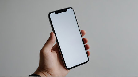 A close-up of a person's hand grasping a sleek smartphone displaying a blank white display, set against a neutral gray backdrop for versatile use.