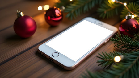 Smartphone with white screen for advertising, mockup, on a Christmas background. High quality photo