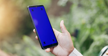 Woman, phone and hands with blue screen for marketing, advertising or app in outdoor nature. Closeup of female person with mobile smartphone display with chromakey or tracking markers on mockup space