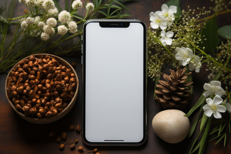 A mockup featuring a smartphone surrounded by pinecones, seeds, and small white flowers, set against a dark wooden background. Blank screen for customization.