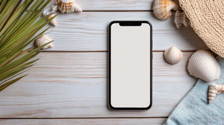 A modern smartphone stands against a clean, white background, its screen a window to a tranquil coastal landscape.