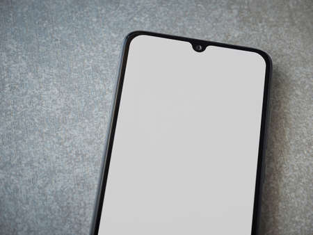 Black mobile smartphone mockup lies on the surface with a blank screen isolated on a porcelain granite ceramic stone background. Top view closeup with selective focus and copy space, cut in the middle