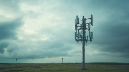 A solitary cellular tower rises against a cloudy sky in a rural landscape, representing the essential role of telecommunication technology in modern connection and communication.