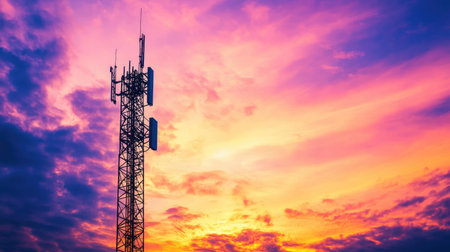 Communication tower silhouetted against a colorful sunset, symbolizing connectivity and technology. Generative AI