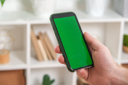 Hand is holding the smartphone with green chroma key screen on home green plants background.