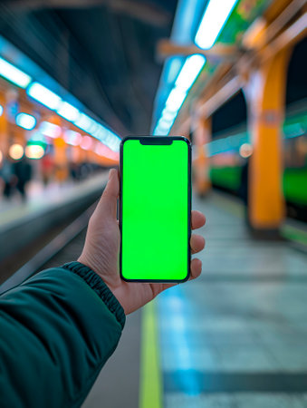 A phone with a green screen in the hand of a man at a railway station, subway. Mock up mobile