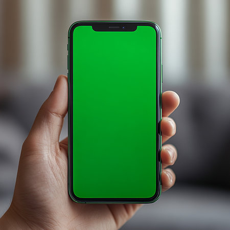 A close-up view of a hand holding a modern smartphone, presenting its green chroma key screen directly to the viewer.