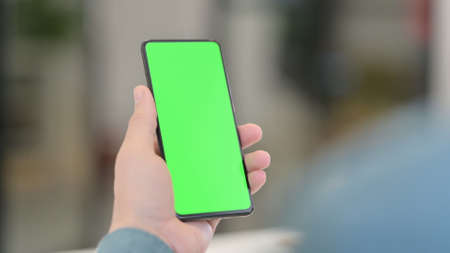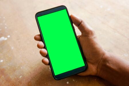 hand of man holding mobile smart phone with chroma key green screen on gren background