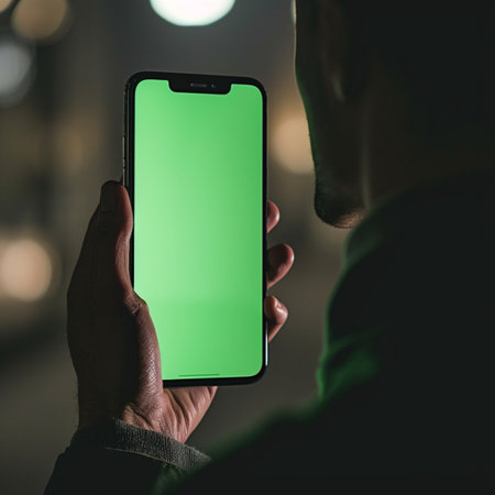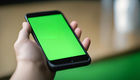 A close-up shot captures a person's hand presenting a smartphone with a green chroma key screen, ready for custom content insertion.