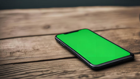 A smartphone with a green screen lies on a wooden table, ready for design mockups or creative editing.