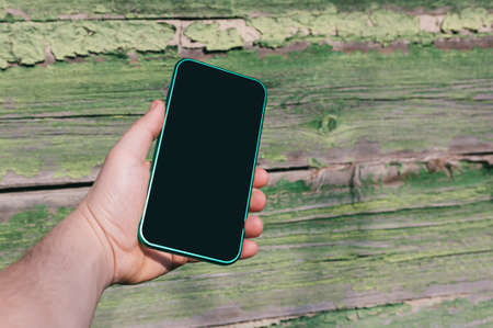 Hands hold the phone with a green chromaque, the rear black blue background with numbers and numerical code. Technology, utilities, communications.