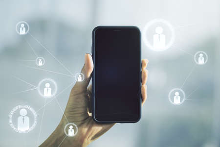 Social network media concept and hand with mobile phone on background. Double exposure