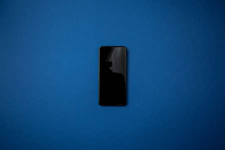 Black smartphone on a blue background. Telephone top view, closeup flat lay.