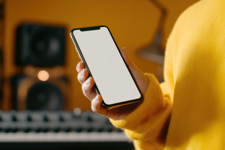 Generative AI : man holding smartphone in hand display blank screen for graphic montage mock up app or website in vertical position on blur background in decoration room