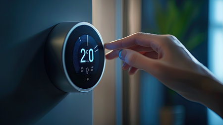 A person's hand is shown interacting with a digital thermostat, highlighting smart home technology and energy efficiency