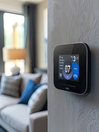 A sleek smart thermostat mounted on a modern living room wall, displaying the current temperature and weather conditions.