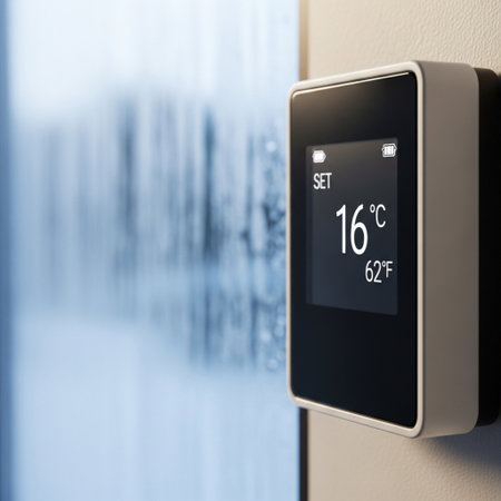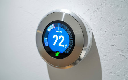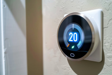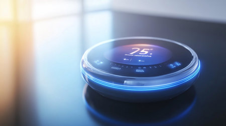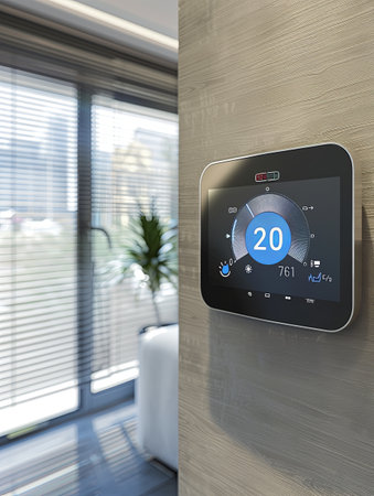 Smart Thermostat Displaying Current Temperature and Settings in Modern Interior Design with Soft Lighting and Minimalist Aesthetic