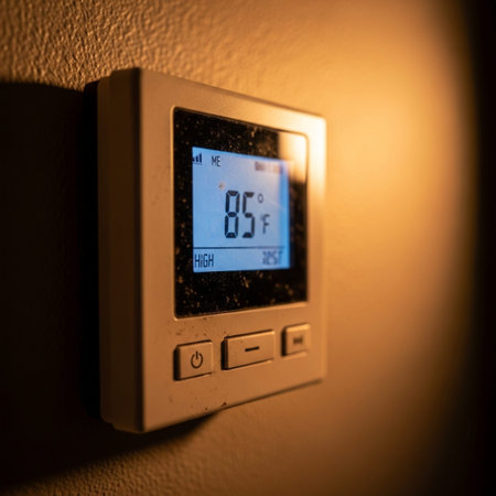 Close-up, cinematic shot of a home thermostat set to an extremely high temperature, emphasizing the
